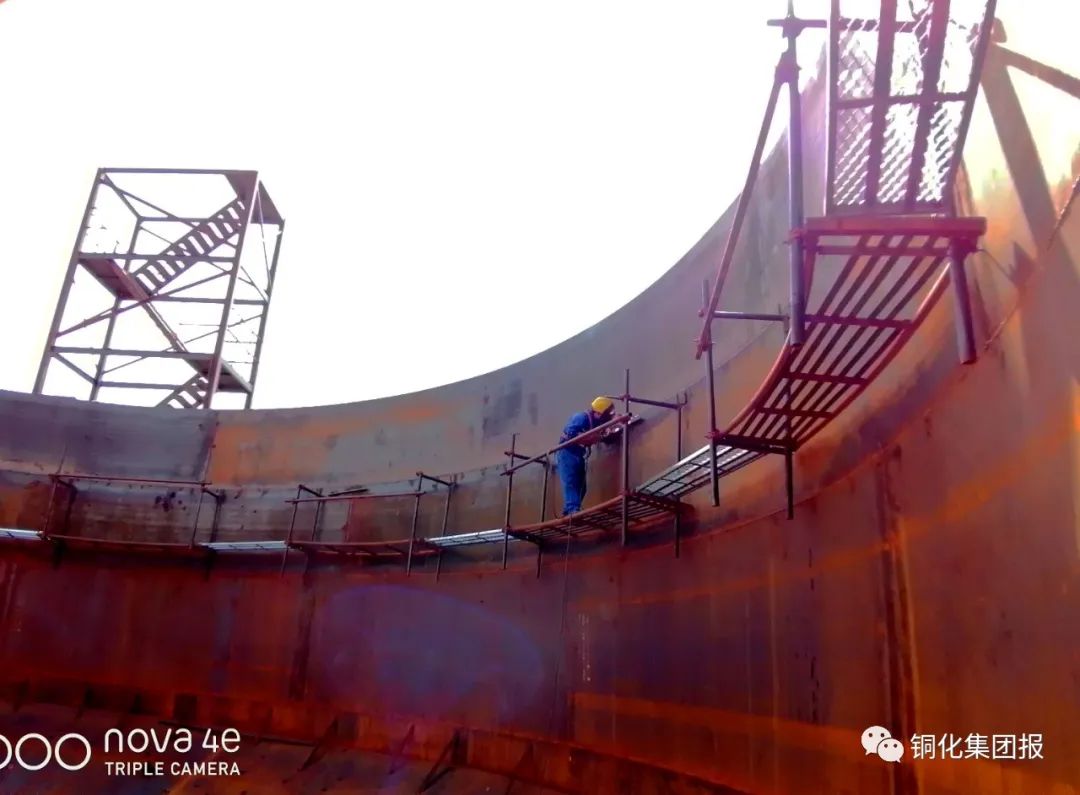 為促進(jìn)礦山綠色發(fā)展,新橋礦業(yè)公司投資近2200萬(wàn)元,對(duì)全尾砂充填系統(tǒng)進(jìn)行技改。該工程于2月動(dòng)工,預(yù)計(jì)7月底收官運(yùn)行。屆時(shí),選礦廠、選鐵廠生產(chǎn)尾砂及污水處理站淤泥經(jīng)混合處理可全部用于井下充填,實(shí)現(xiàn)礦山生產(chǎn)固廢零排放。圖為5月21日,工人正在施工現(xiàn)場(chǎng)焊接直徑18米的深錐濃密池?!√丶s記者/ / 朱常林/ / 攝