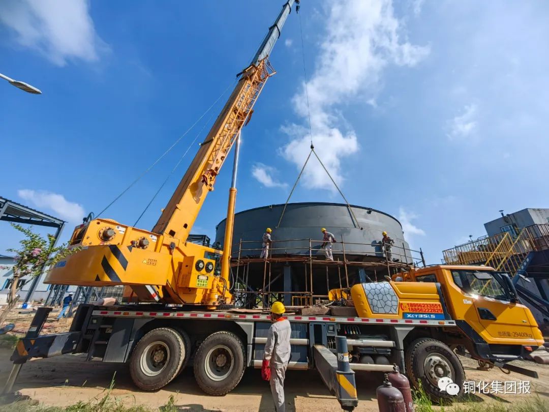 項目完工投用后,每年可處理選礦廢水247.5萬立方米、酸性廢水1000萬立方米,去除COD1485噸、硫化物146.03噸、重金屬錳208噸,在保障原生產(chǎn)線正常運行的同時,顯著降低相關污染物排放,實現(xiàn)外排水水質(zhì)穩(wěn)定達標,有效保護當?shù)厮h(huán)境,環(huán)境效益和社會效益顯著。上圖為吊裝作業(yè)現(xiàn)場。