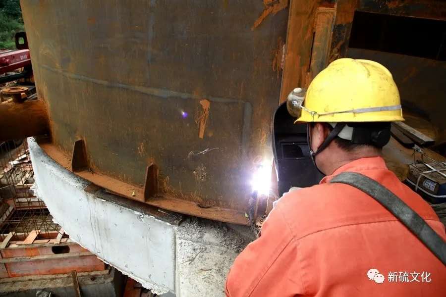 已近正午12點,龐然大物終于平穩(wěn)“落座”,我便收工吃飯,但是高臺上更為緊張的忙碌仿佛剛剛拉開戰(zhàn)幕。接近1點,在高臺上草草用過盒飯的好“焊”們已經(jīng)完成了浮選機(jī)槽體與底座的調(diào)試、找平,開始焊接底座。由于槽體緊貼底座地面,好“焊”賀家斌干脆睡倒在地作業(yè),可即使采用這種罕見的“臥式”焊接,槽體底部的幾處邊邊角角還是無法焊接到,眉頭擠成了“川”字的賀家斌來回調(diào)整“睡姿”都不理想,恨不得立即將地面掏出一個洞,人降到洞內(nèi)焊接——突然他靈機(jī)一動,將筆直的電焊條擰成彎曲狀,利用焊條弧度完成了邊角處的焊接。